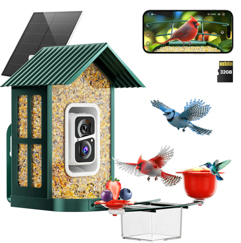 2K HD Camera with AI Bird ID Captures crystal-clear videos and photos while automatically identifying different bird species.